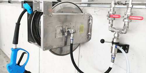 Ein Maschinenwaschplatz funktioniert effektiv mit flexiblen Wasserleistungen, Heißwasser und einem möglichen Reinigungsmittelzusatz.