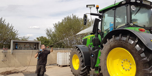 In der Waschhalle des Lohnunternehmers Schafmeister in Ostwestfalen-Lippe kann an drei Waschplätzen gleichzeitig mit insgesamt 4 Personen gereinigt…